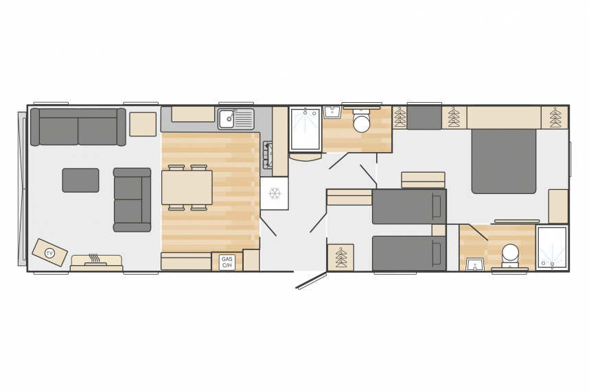 Offering luxury and sophistication, the Swift Vendee is fully furnished and equipped with high-quality surfaces. The spacious kitchen has a 5-burner gas hob, an oven, an integrated microwave, a fridge-freezer and a wine rack. The Vendee has two bathrooms, one of which is en-suite in the master bedroom. Comfortable mattresses ensure a good night’s sleep. An electric ‘Optiflame’ fireplace provides extra atmosphere. The Vendee is the perfect choice for a luxurious and carefree stay.